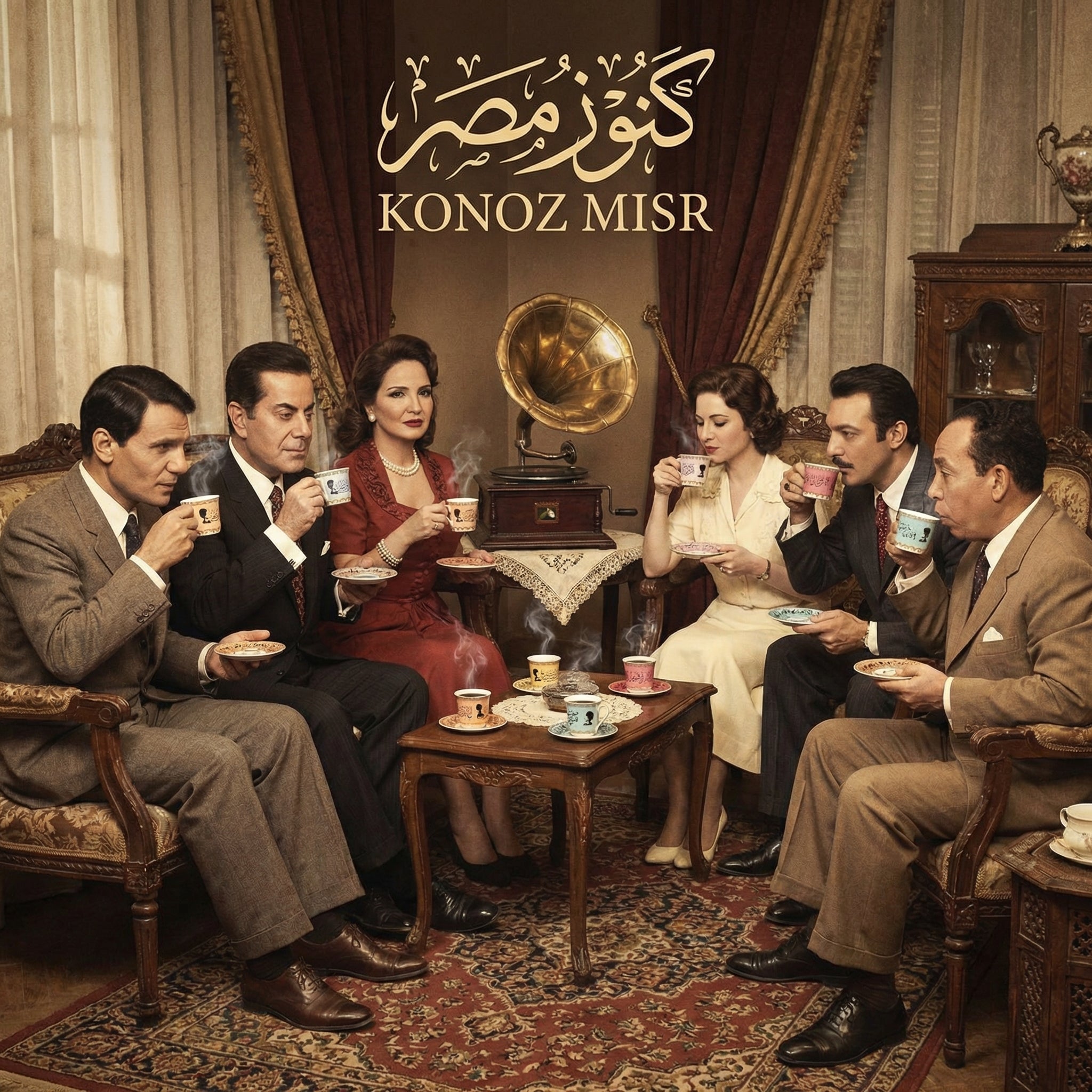 طقم فناجين قهوة "ليالي الشرق" بورسلين فاخر - المصرية الألمانية فتحي محمود - سحر الزخارف العربية بألوان الأزرق والبرتقالي الساحرة من كنوز مصر