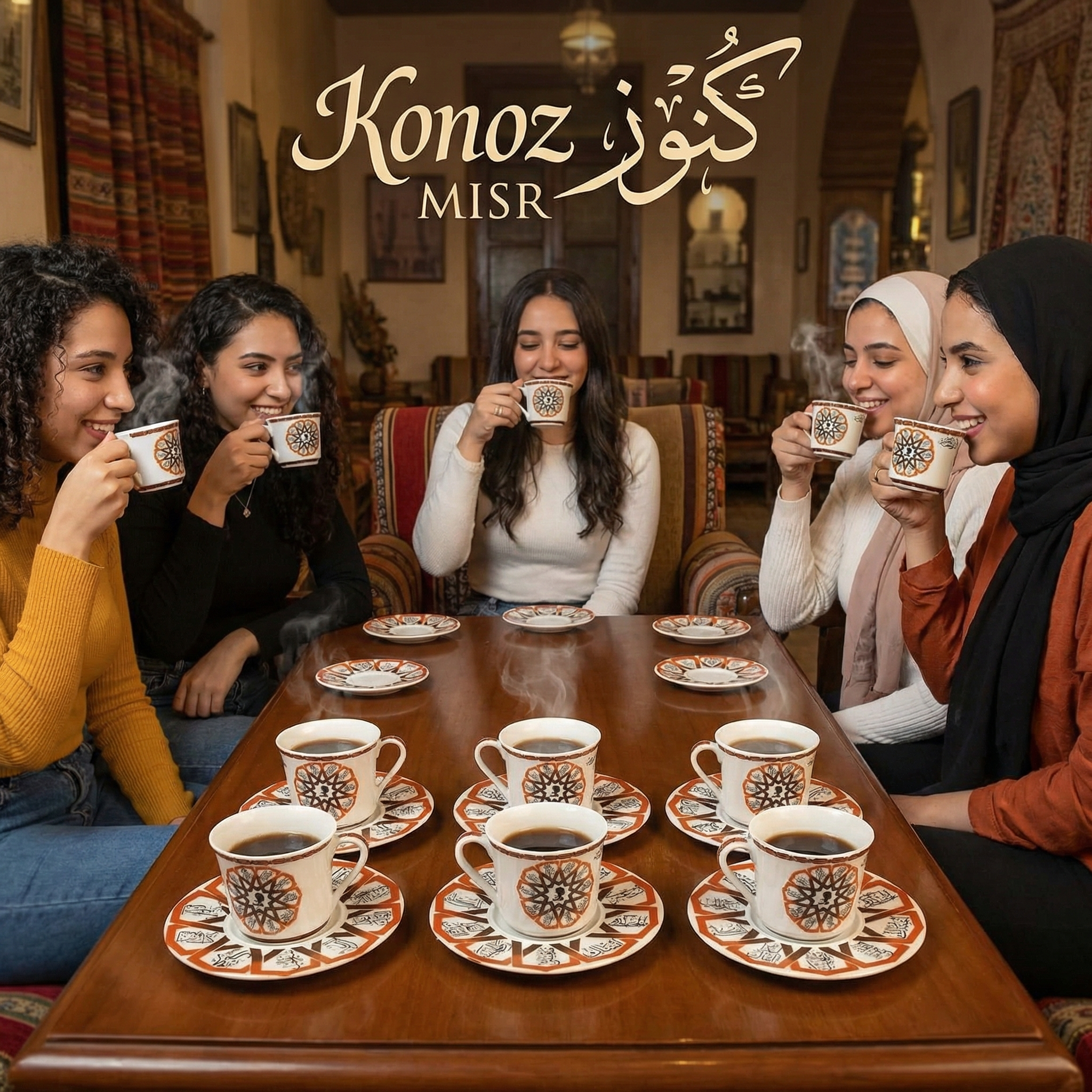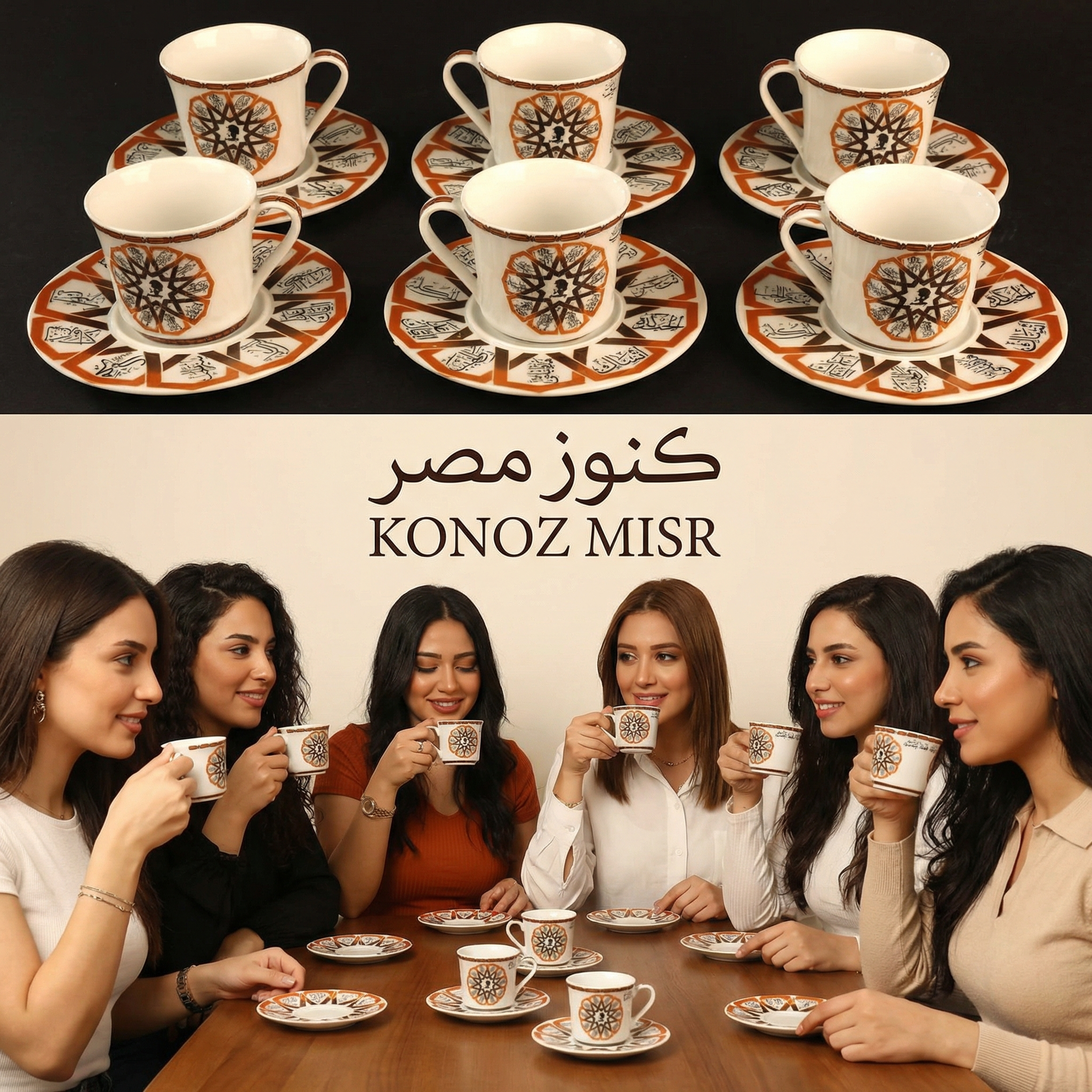 طقم فناجين قهوة "مجد التراث" بورسلين فاخر - المصرية الألمانية فتحي محمود - تحفة فنية تجسد عظمة التراث المصري من كنوز مصر